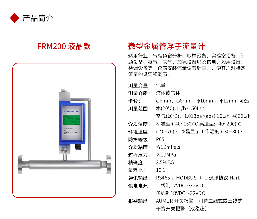 微型金属管浮子流量计是测量微小流量的金属管浮子流量计,可以测量微小流量的气体和液体。全金属结构设计,适用于高温高压和腐蚀性介质条件。该流量计可广泛应用于气相色谱分析、取样设备、实验室设备、制药设备、氮气、氩气、加氧设备以及核电、船用设备、检漏设备等。仪表安装流量调节针阀,方便客户对特定流量的设定和调节。咨询热线:400-152-1718